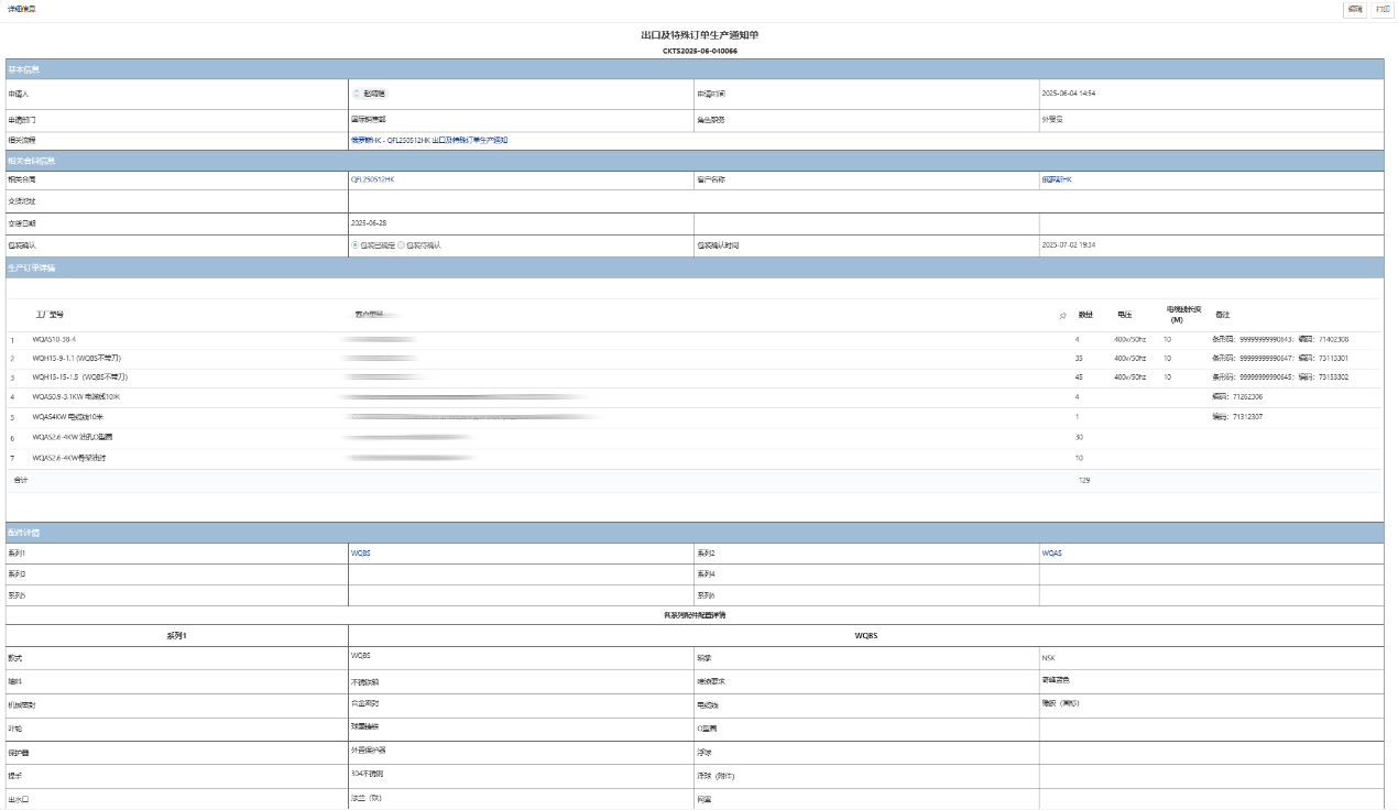 Order Reception & Validation: After a sales contract for KBZ series pumps is approved via the OA System, it is formally converted into a valid production requirement. Planners then create a production order (e.g., "KBZ33.7 Submersible Pump") in the system, specifying key details such as specifications, quantity, special configurations, and delivery date.